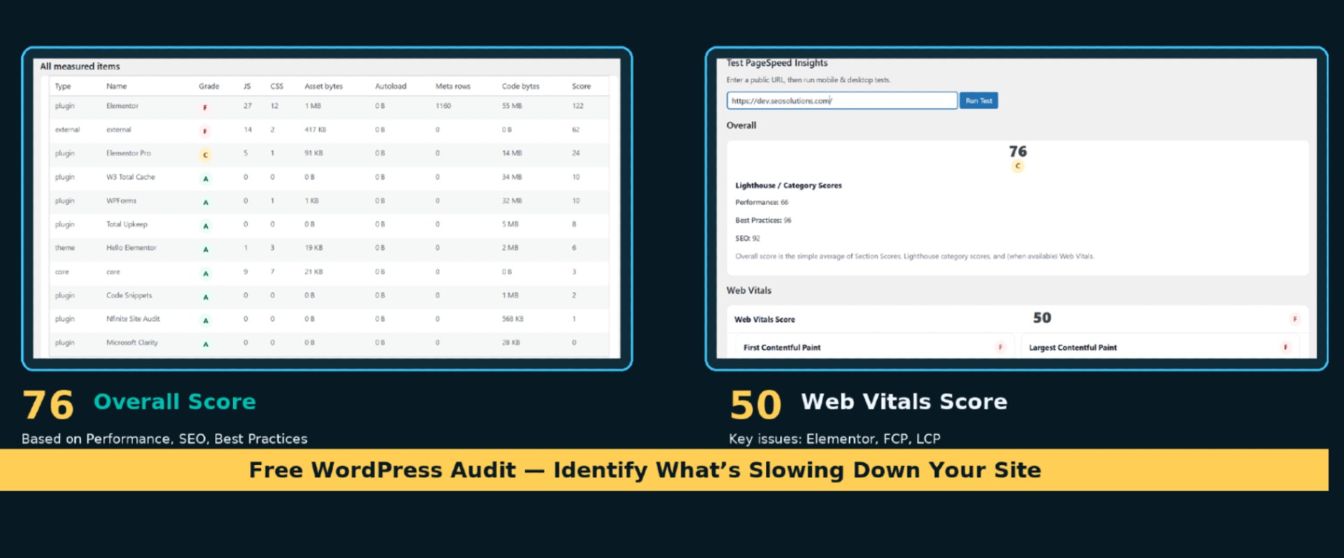 "With the Free WordPress Audit, you’ll see live performance and SEO data in just seconds. The tool measures your SEO score, site speed, and Core Web Vitals so you can identify slow-loading plugins, bulky themes, or Elementor pages that hurt performance."